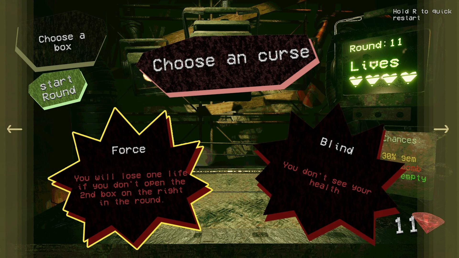 『Open or Die』は、目の前に並ぶ複数のボックスを好きな数だけ開けるゲームです。ボックスの中には富をもたらすダイヤが入っているものもあれば、死をもたらす罠が仕掛けられているものもあります。プレイヤーは限られた情報の中で、どこまでリスクを冒すのかを判断しなければなりません。