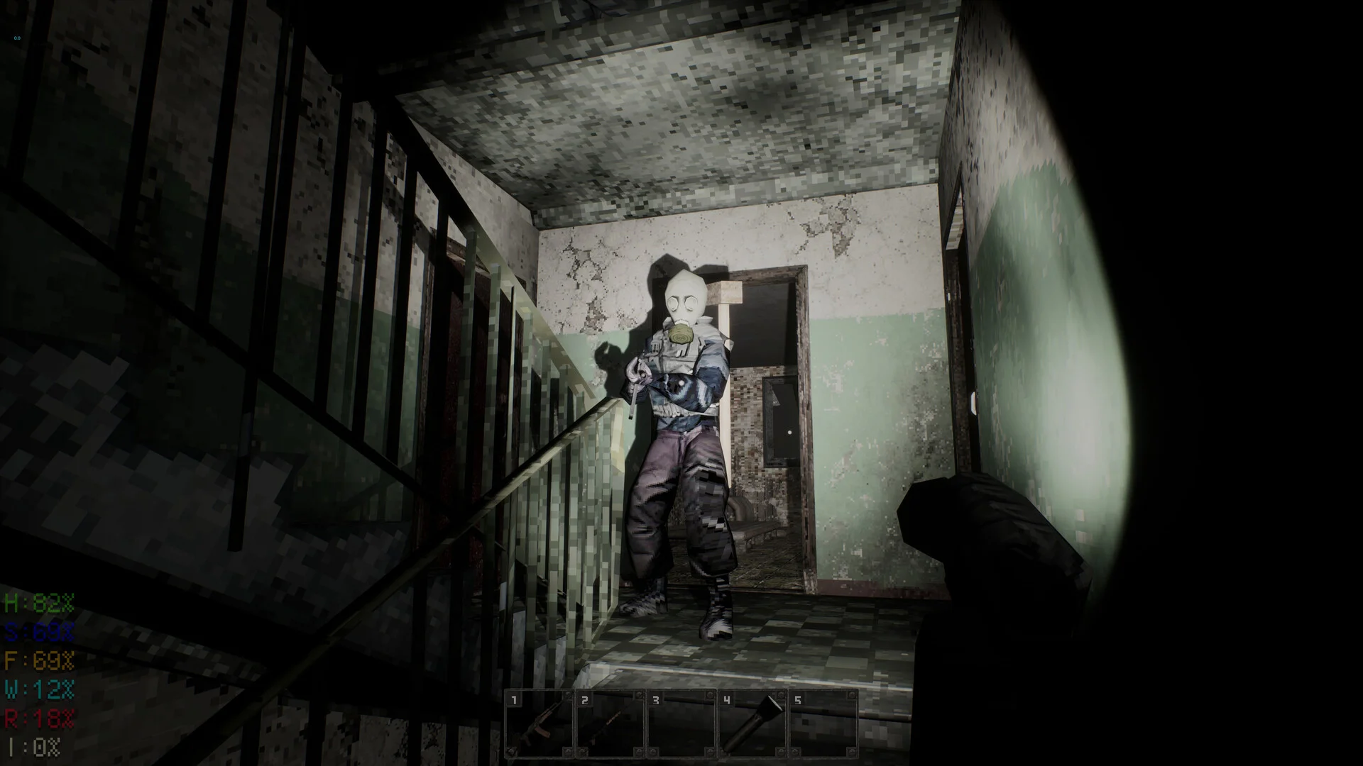 『MISERY』のプレイの中心となるのは、放射能に汚染された廃墟での探索と資源採集です。プレイヤーたちは自動生成される奇妙な世界を歩き回り、武器やツール、食料、建築材料といった様々なアイテムを探し出します。集めた資源はバンカーの建設やクラフトに充てられ、チーム全体の生存基盤を整えていくことになります。