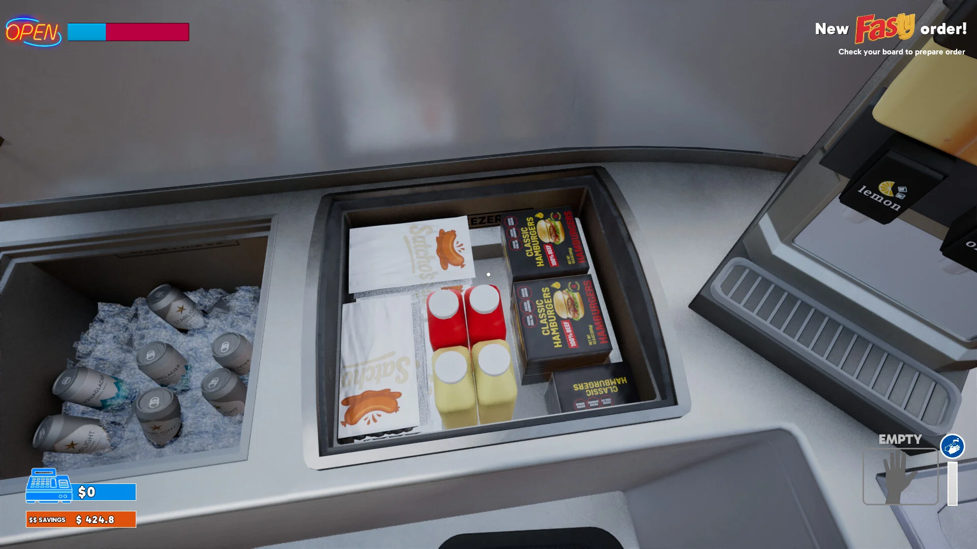 『Hotdog: The Videogame』では、限られた資金で屋台をスタートさせ、効率的な経営を通じてビジネスを拡大していきます。扱う商品はホットドッグだけに限らず、ハンバーガーやフライドポテト、コーヒー、アイスクリーム、ソーダなど、ファストフード店に欠かせないメニューが揃っています。