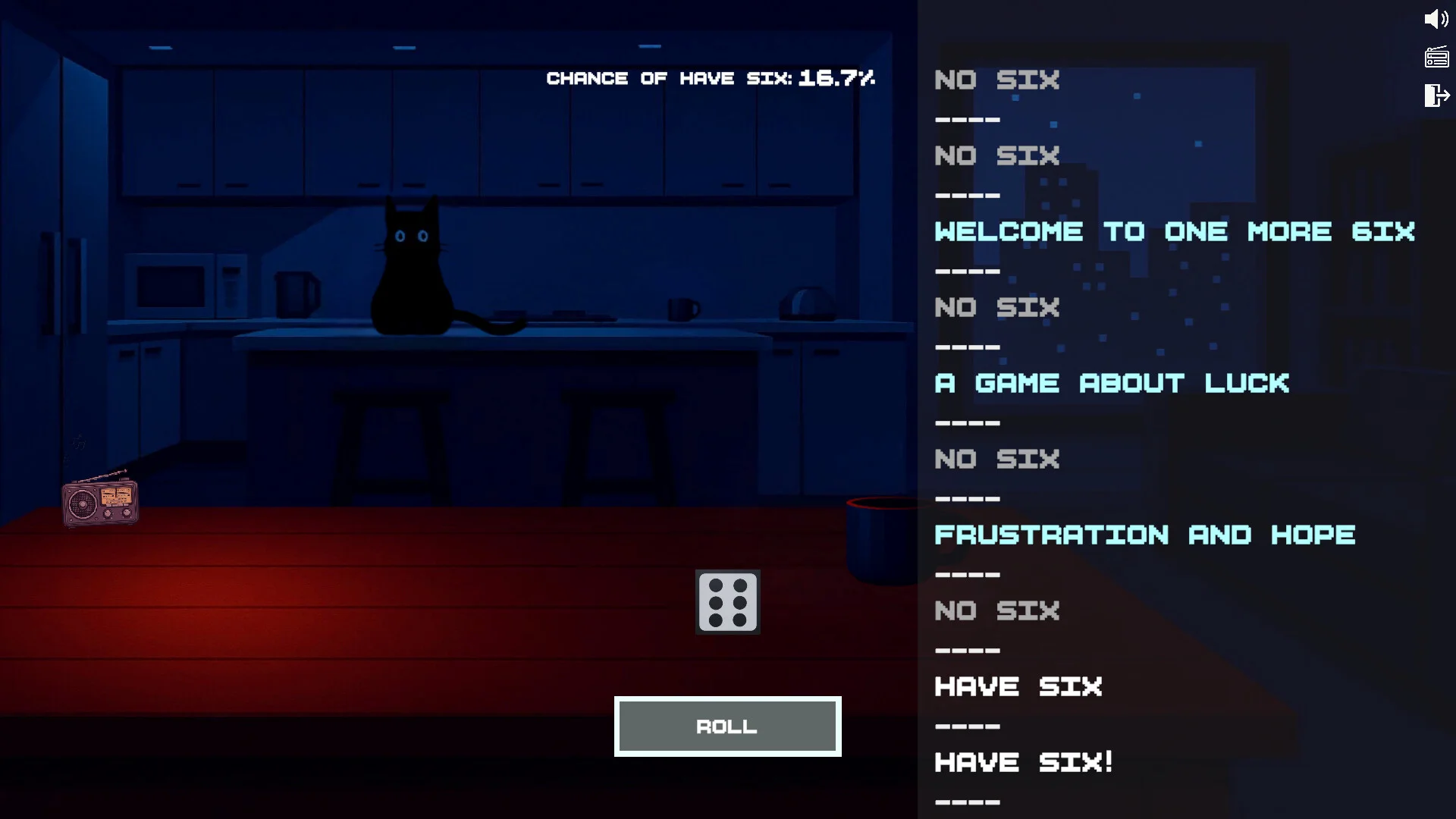 『One More 6ix』の舞台は深夜の部屋。黒猫がキッチンアイランドの上で静かに座り、深夜ラジオが小さく流れる中で、あなたはサイコロを振り続けます。ゲームの哲学は明確です――勝利そのものが目的ではなく、サイコロを振る直前に「まだ自分を信じていられる、その一瞬が大切」なのです。
