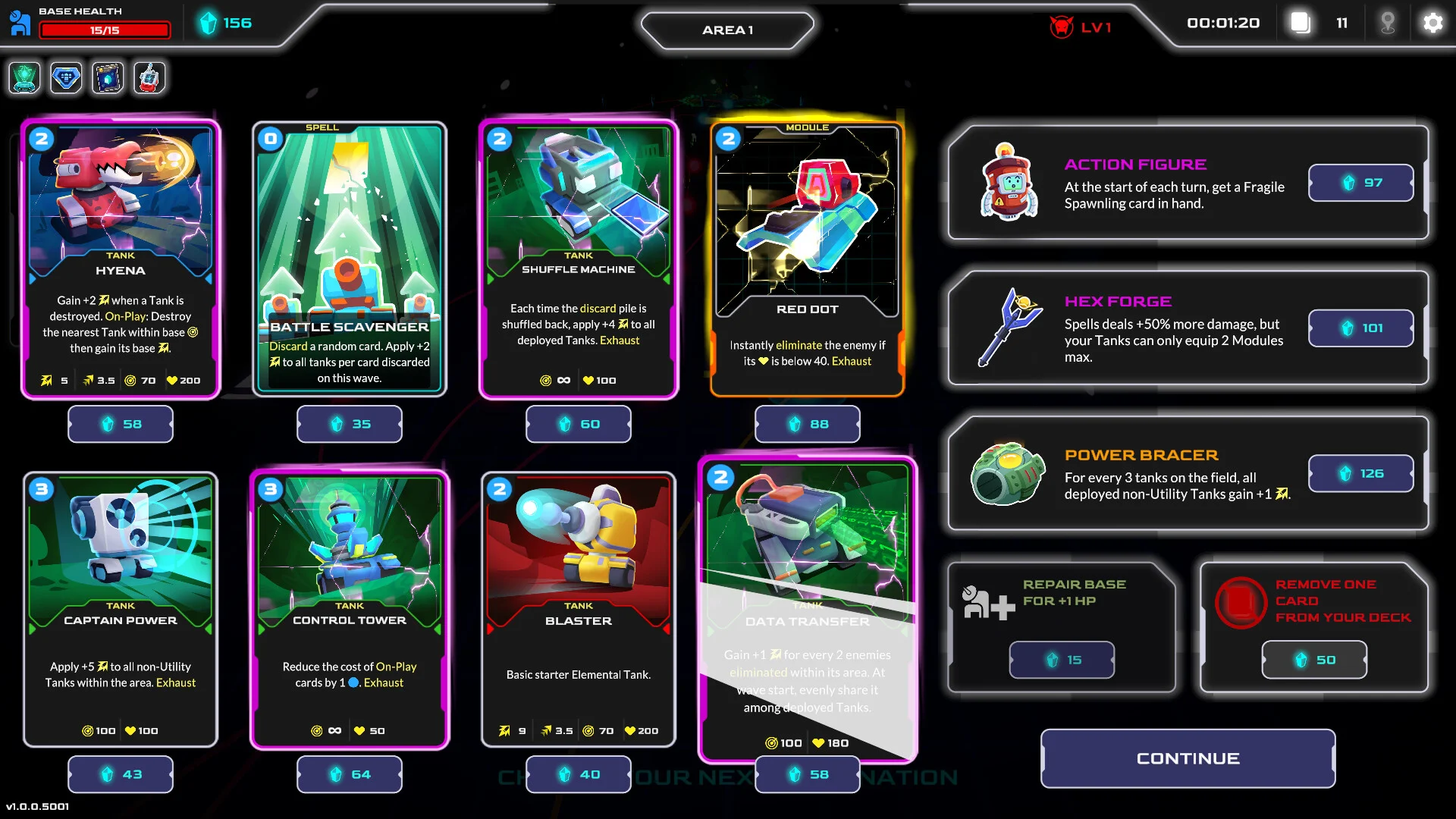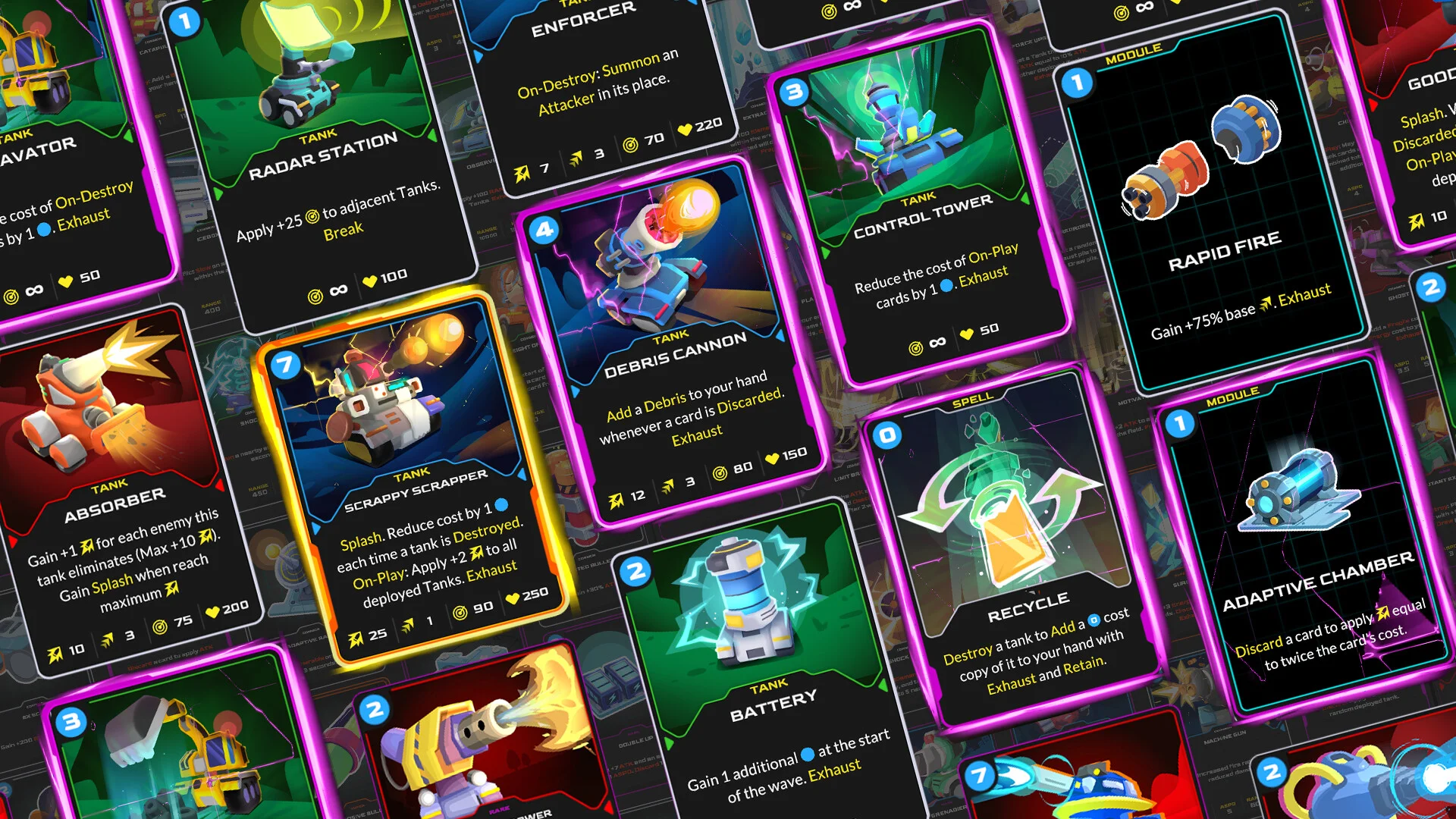 ゲームプレイの中心は、ミニタンクとモジュール、スペルで構成されるデッキの構築です。各ウェーブでは限られたエネルギーを消費してカードをプレイし、配置したタンクでエイリアンを撃退する流れです。Hyena(ハイエナ)のようなタンクは破壊されるたびに攻撃力が上昇し、Furnace(炉)は焼却効果を火力に変換するなど、カード間のシナジーが戦局を左右します。