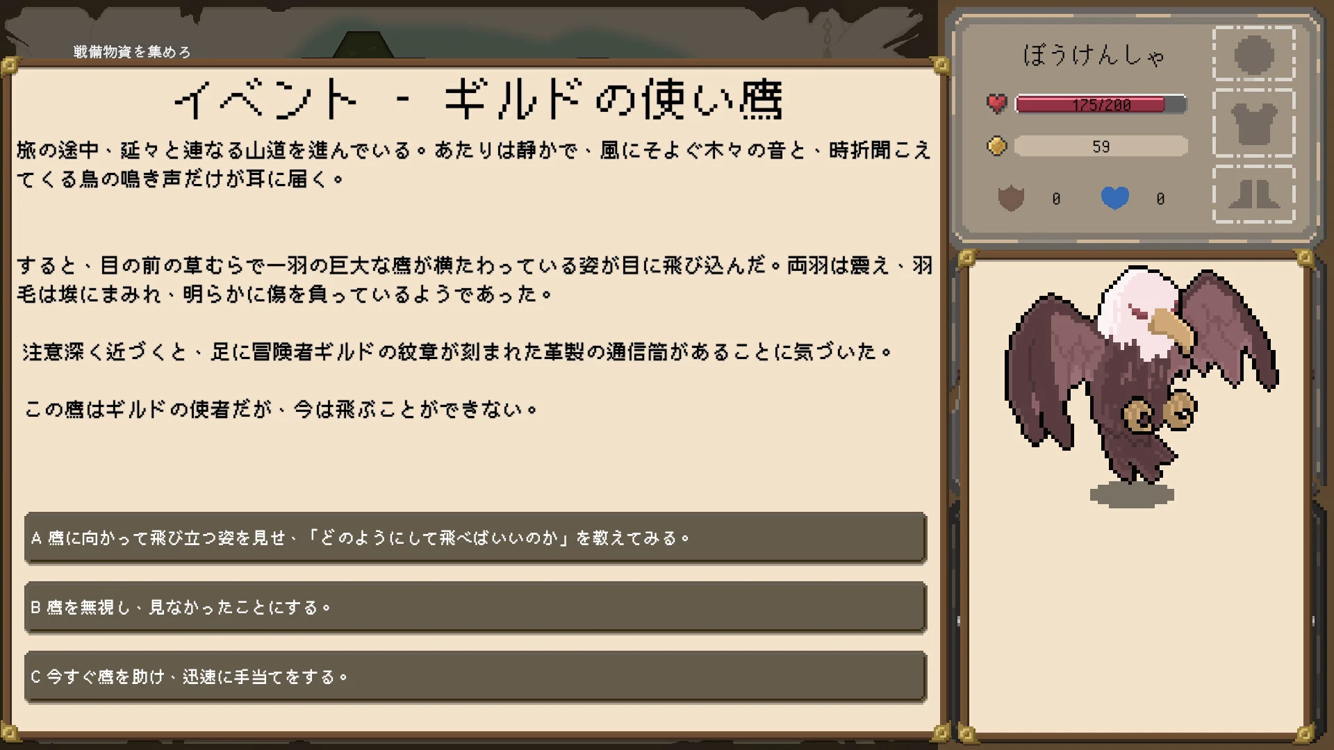 毎回の冒険でマップとイベントの組み合わせが変化するため、同じステージでも周回するたびに新しい展開が待っています。選択肢によって分岐する選択肢システムも搭載されており、プレイヤーの判断がストーリーの進行を左右する設計になっているようです。