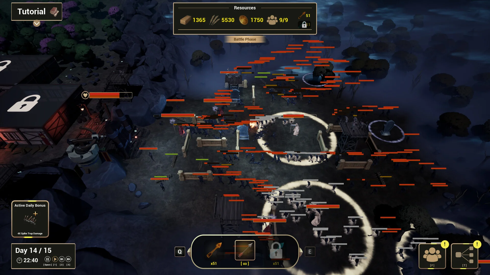 夜間になると状況は一変します。アンデッドの軍勢が宿屋の門へ押し寄せ、防衛線を敷いて敵の侵攻を食い止めなければなりません。昼間に集めた資源を活用しながら、タワーディフェンス的な戦術で敵波を撃退する必要があります。