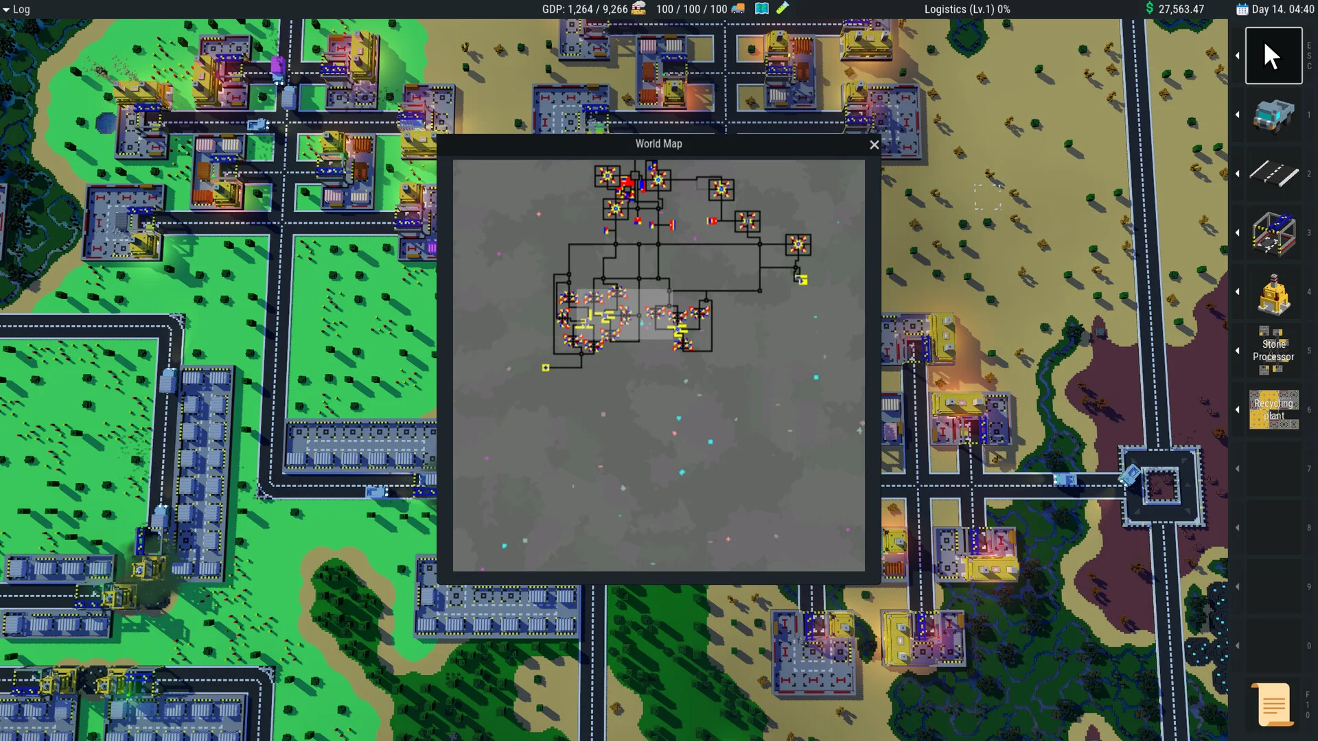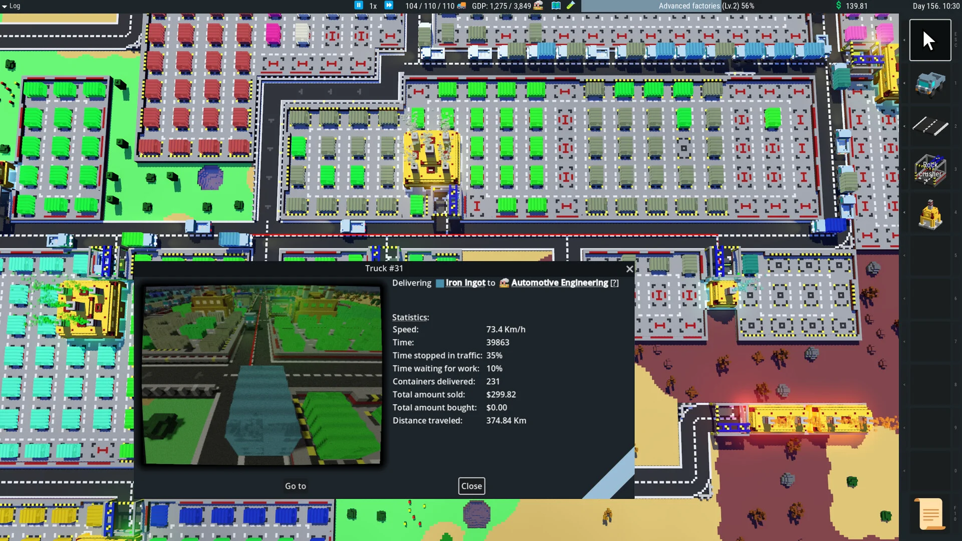 『Truck City』の核となるのは、複数の工場を結ぶ物流ネットワークの構築です。鉱山で採掘した鉱石をトラックで運び、精錬工場で処理し、さらに加工工場で複雑なアイテムへと変換していきます。各工場の優先順位を設定し、トラック車隊を効率よく配置することが成功のカギになります。