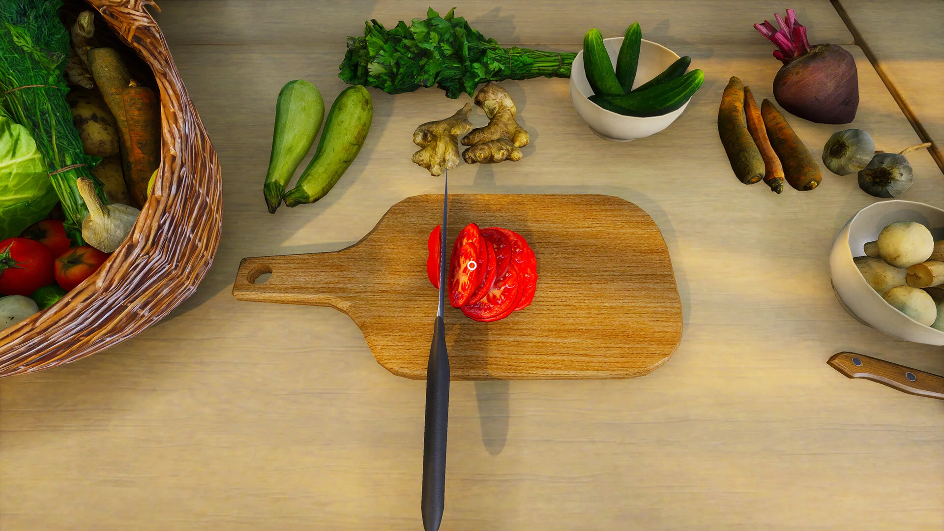 料理シーンでも高いグラフィック品質が光ります。新鮮なトマトをスライスする瞬間や、色とりどりの食材が並ぶ市場の風景、チーズやワインが美しく盛り付けられたテーブルなど、食材一つ一つの質感や色彩が丁寧に再現されています。調理過程では、包丁の金属光沢やトマトの瑞々しさまで表現され、まるで本当にキッチンに立っているかのような感覚を楽しめます。