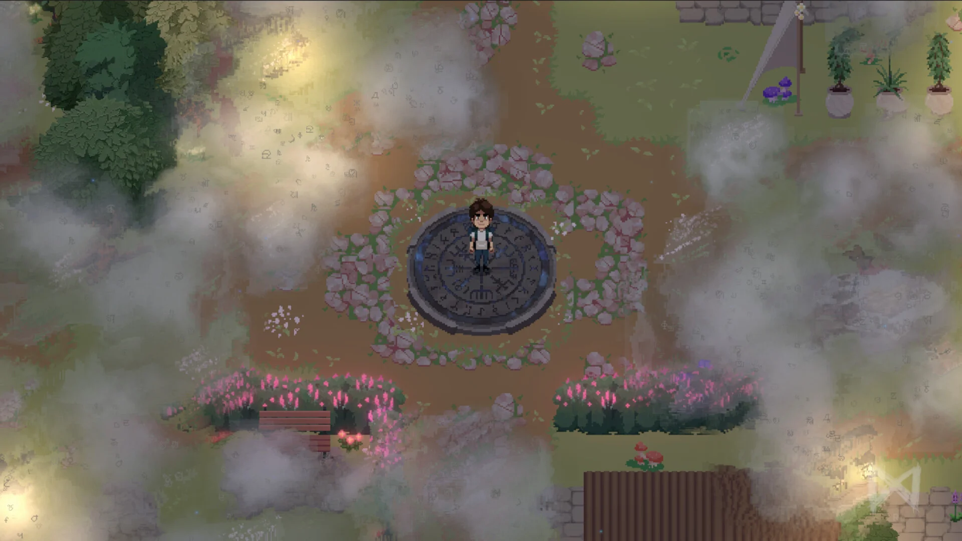 一面に咲き誇る花々に囲まれた幻想的な遺跡では、中央に鎮座する古びた台座が物語の核心を予感させます。柔らかな光と霧が織りなす神秘的な情景は、重要な転換点となる場所であることを示唆しています。