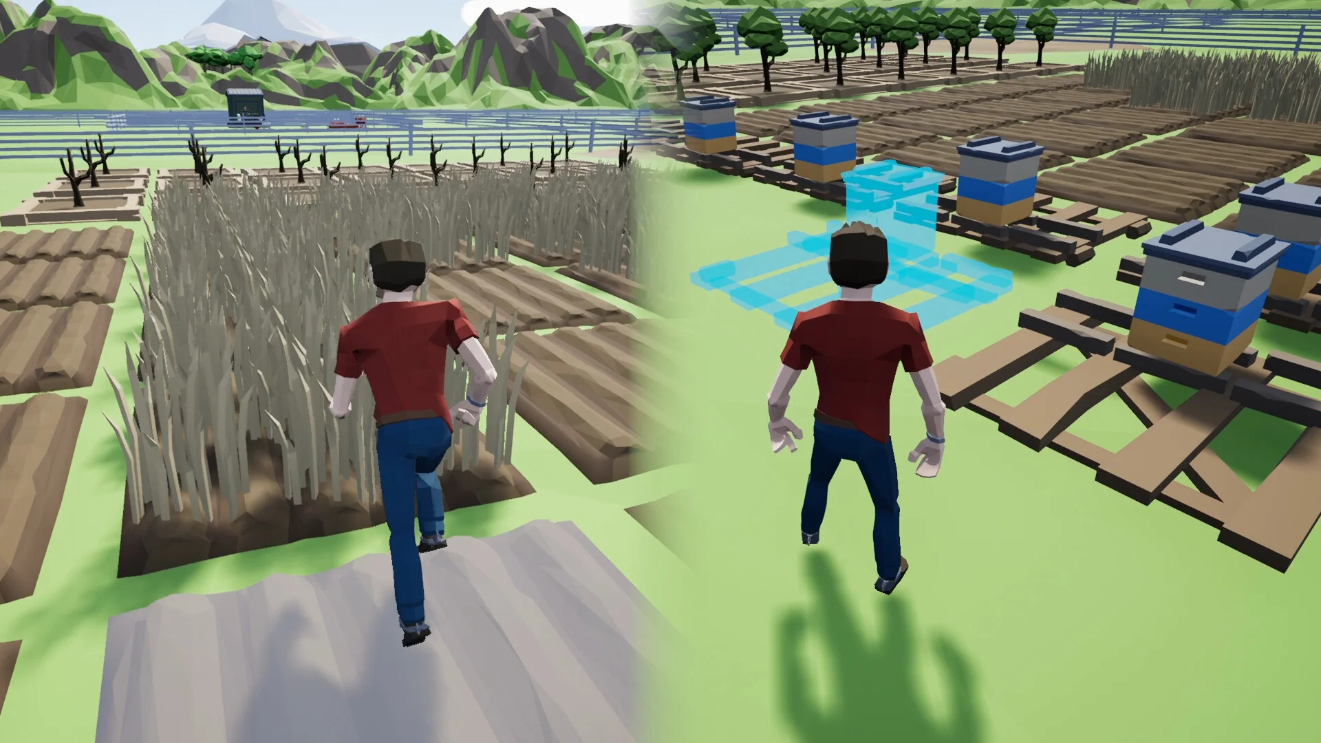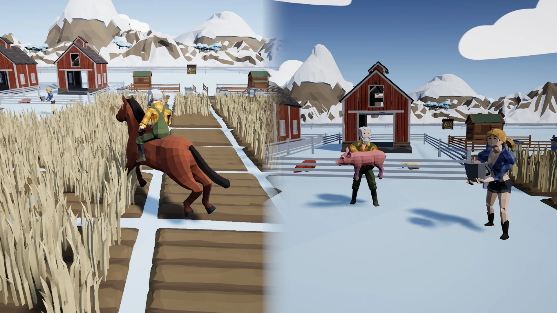 本作はローポリゴンスタイルの親しみやすいグラフィックを採用しており、カラフルで温かみのある世界観を演出しています。雪に覆われた冬の農場から、緑豊かな夏の牧草地まで、季節ごとの美しい風景を楽しめます。シンプルながらも効果的なビジュアルデザインにより、大規模な農場運営もストレスなく行えるよう配慮されています。