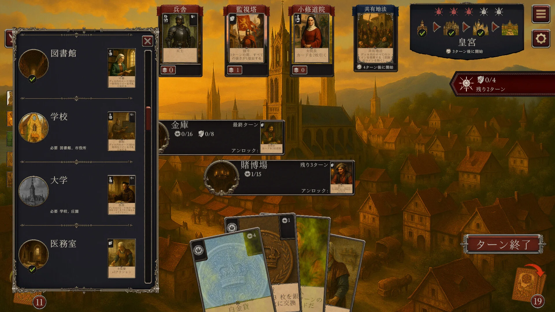 本作では建築物がそのままデッキの強化に直結する仕組みが採用されており、都市の発展とデッキの成長が密接に連動しています。酒場や税関といった施設を建設することで、それぞれに対応した戦略カードが手に入り、プレイヤーの戦術の幅を大きく広げていきます。
