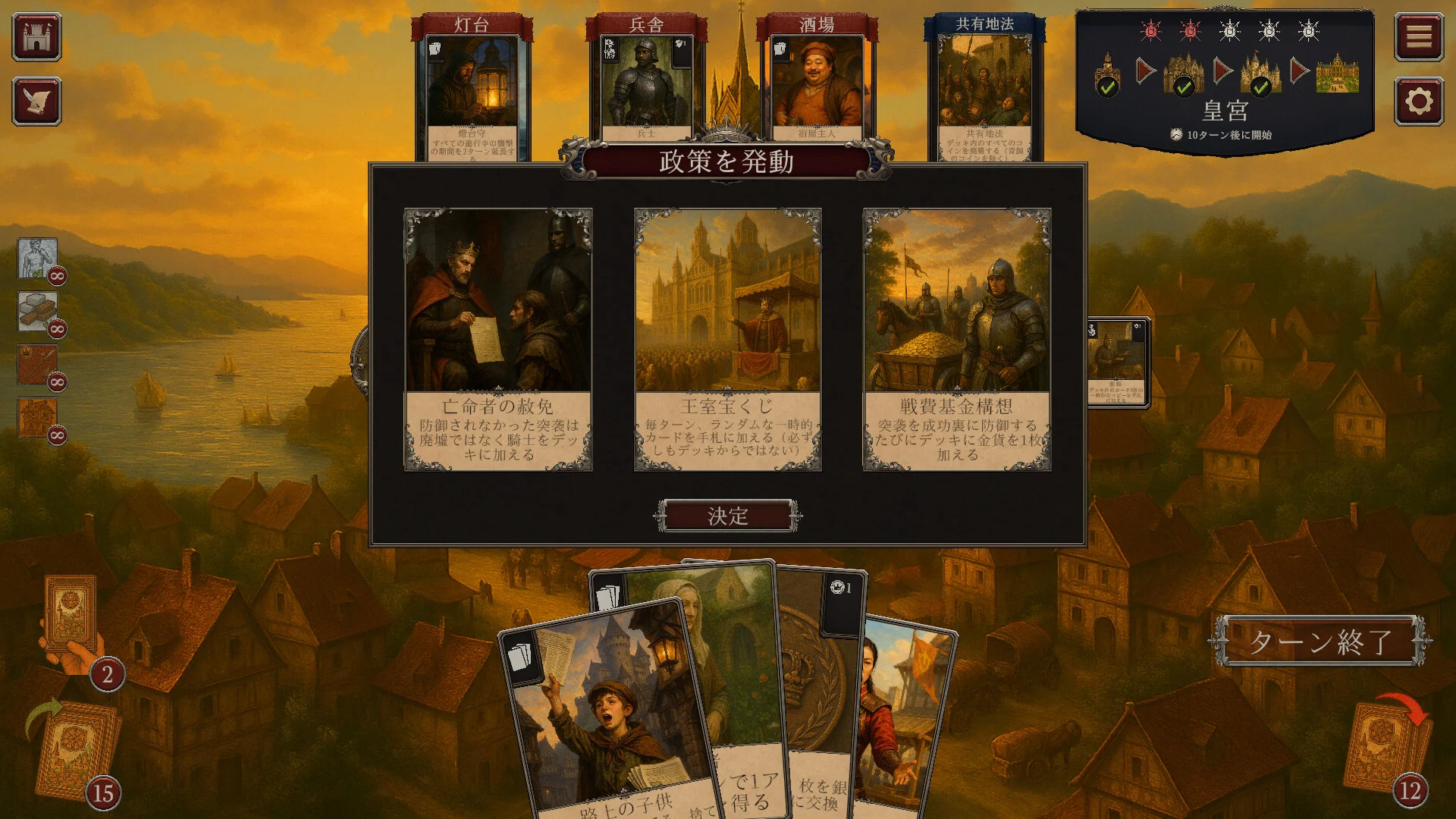 本作の特徴的なシステムとして、国家政策の発動があります。「亡命者の赦免」「王室宝くじ」「戦費基金構想」といったさまざまな政策から選択し、都市全体に大きな影響を与えることができます。これらの政策はデッキとの相乗効果を生み出し、プレイヤーの戦略に深みをくわえます。