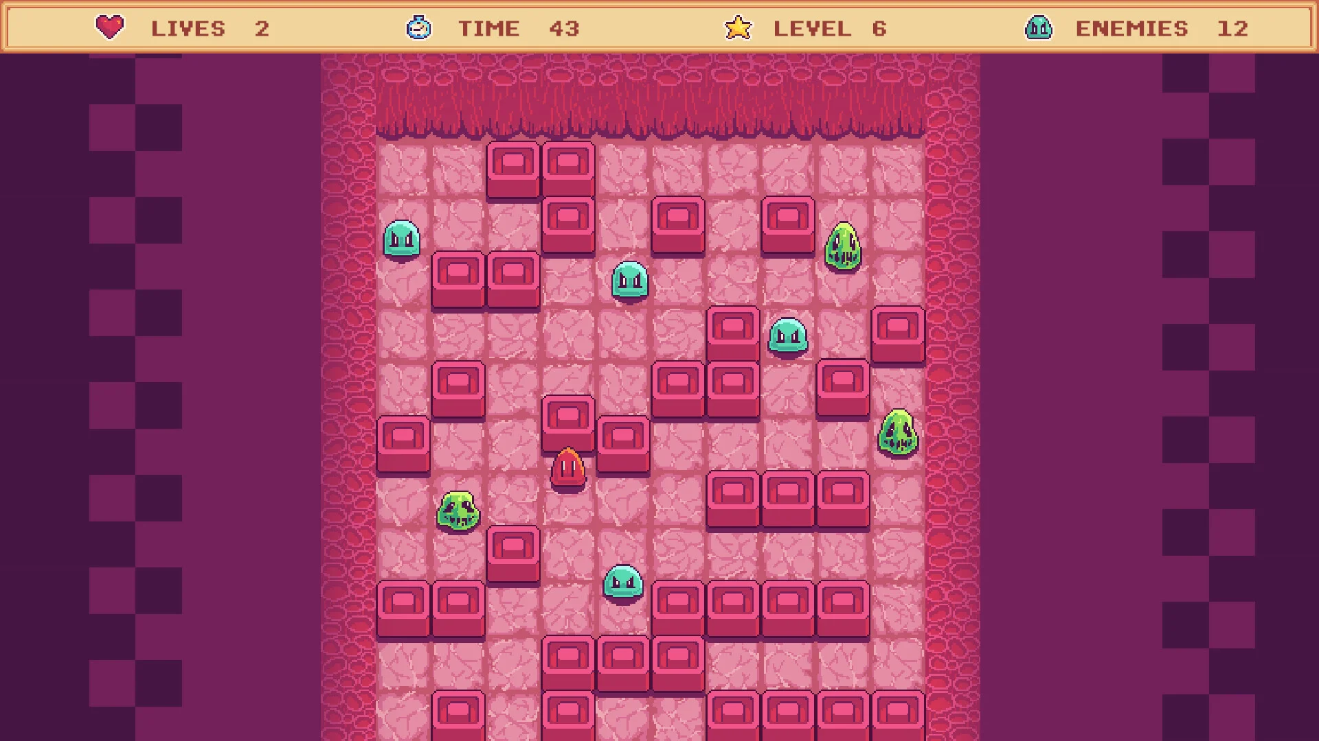 ゲームプレイ画面では、赤いプレイヤーキャラクターが細胞膜でできた戦場を駆け巡ります。フィールドにはピンク色の箱が配置され、水色や緑色などカラフルな敵キャラクターが登場します。画面上部には残機、残り時間、現在のレベル、残り敵数といった重要な情報が表示され、プレイヤーは限られた時間内でステージをクリアする必要があります。