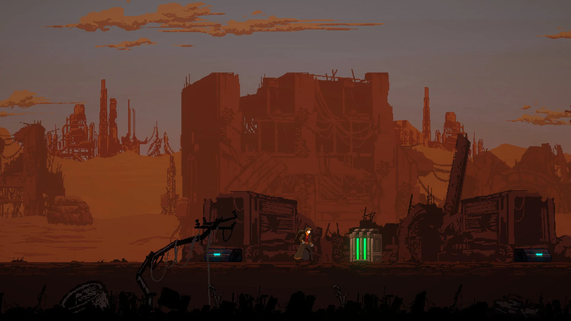 ゲームの舞台は、かつて栄えた文明の残骸が点在する終末世界です。崩壊した建造物や巨大なクレーンの残骸、廃墟と化した都市が広がる中、プレイヤーは孤独な戦いを強いられます。茶色を基調とした砂漠の大地と鮮やかな青空のコントラストが、美しくも物悲しい世界観を演出しています。