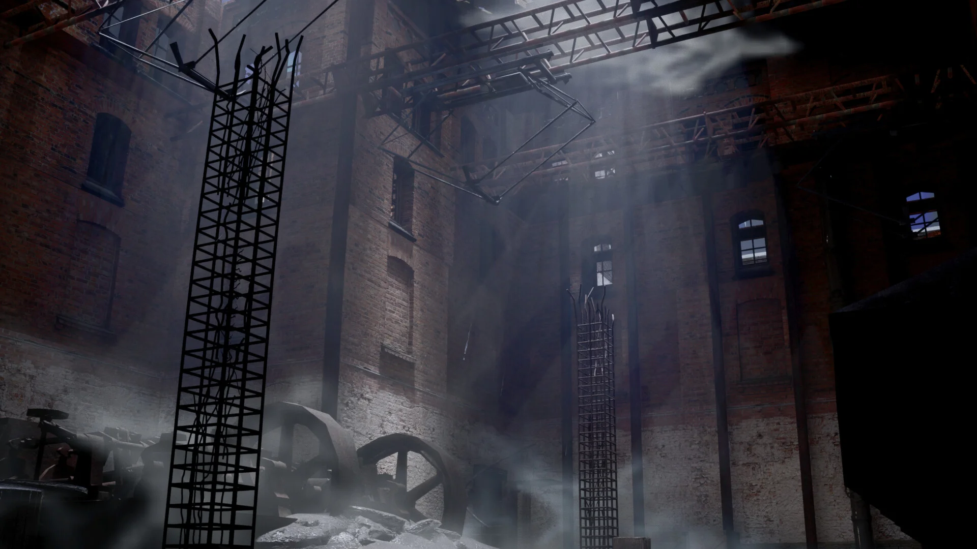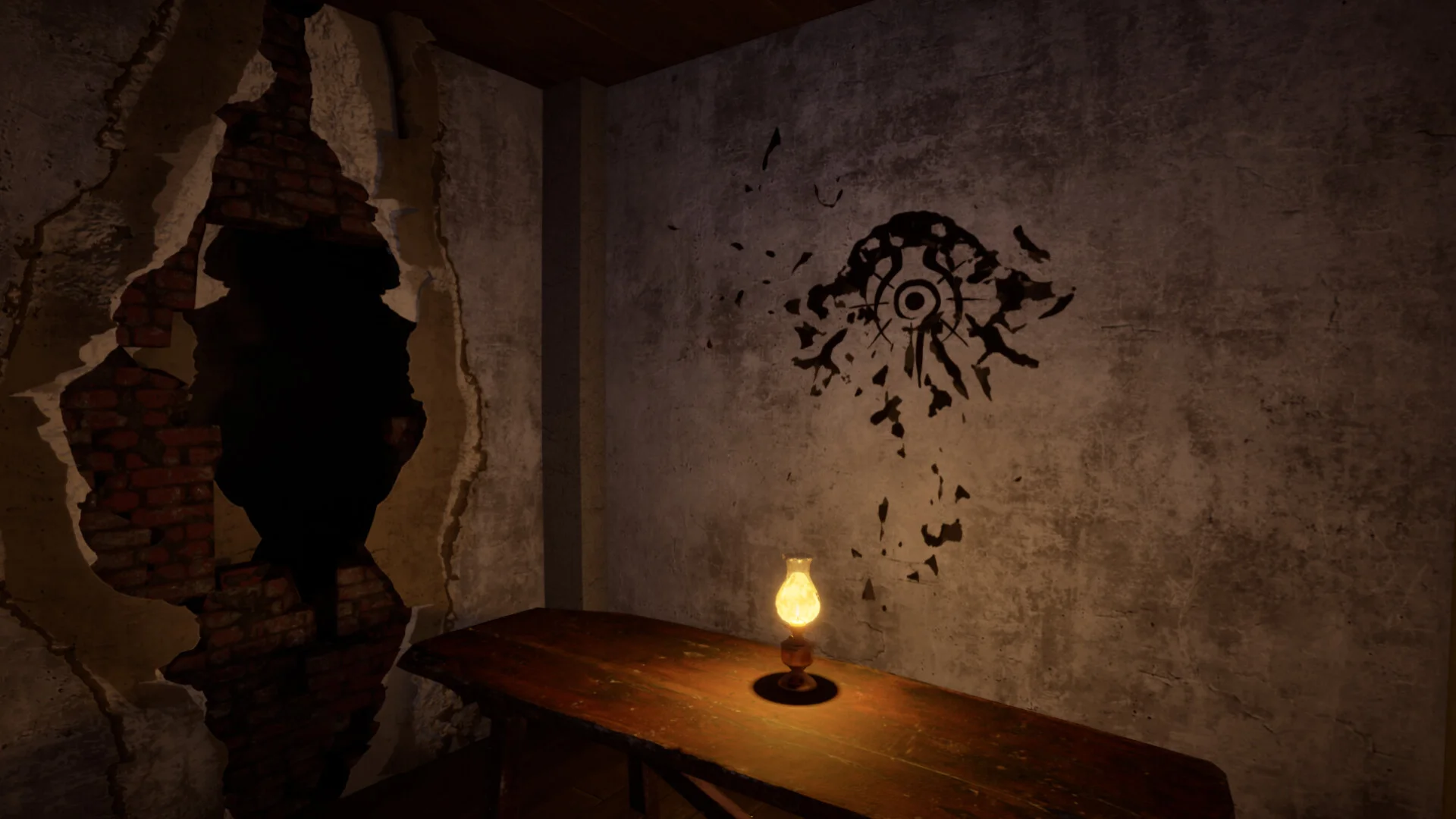 本作のビジュアル表現は、ライティングの巧みさが際立っています。天井から差し込む光が舞い上がる埃を幻想的に照らし出す廃工場、オイルランプの淡い光が不気味なシンボルを浮かび上がらせる壁、そして赤く光る目を持つシルエットが立ち塞がる通路――暗闇と光のコントラストを活用した演出が、心理的な恐怖を効果的に増幅させています。