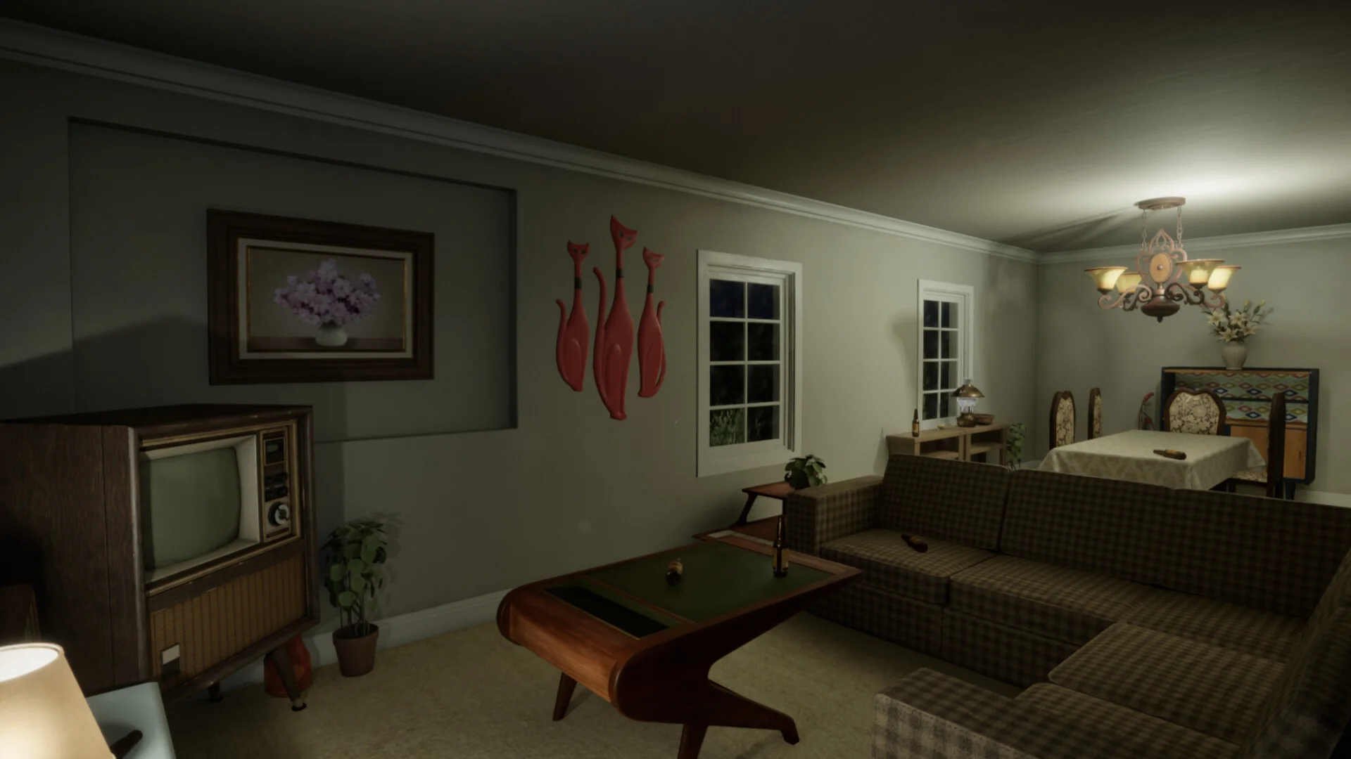 古びたダイヤル式電話機、手書きのメモ、赤い表紙の日誌といった小道具に至るまで、細部にわたってこだわり抜かれた環境設計が、プレイヤーを深く没入させます。レトロな家具が整然と並ぶリビングルームから、血痕が残る荒廃した部屋へ――対比される空間群が、この街に起きた悲劇の重みを物語っています。