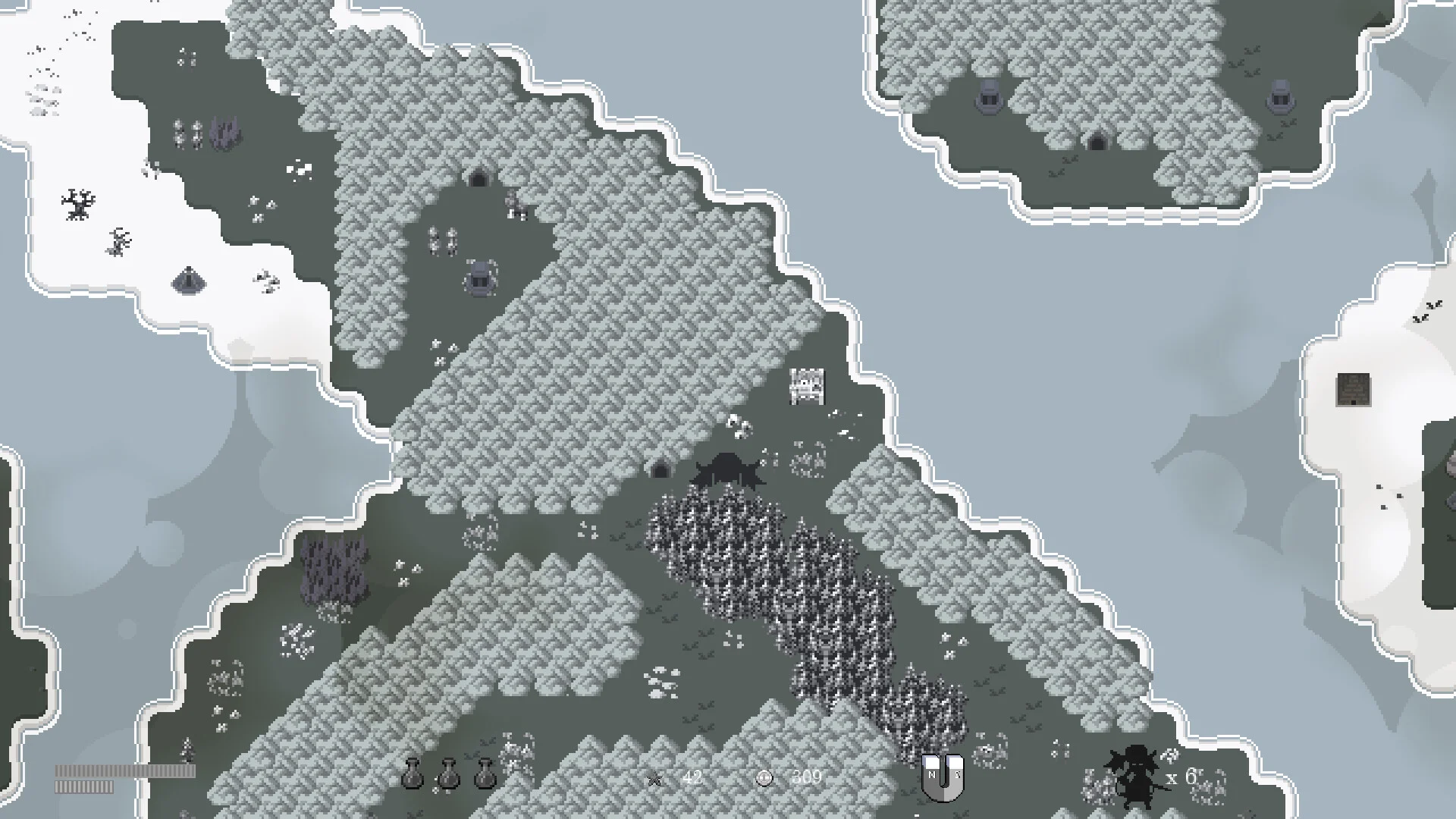 ゲーム内の世界はさまざまな環境で構成されています。ワールドマップ上には青い海に浮かぶ複数の島々が配置され、温暖な陸地から一面の雪景色が広がる雪原まで、異なる気候や環境での冒険が楽しめます。各エリアには独特の雰囲気があり、探索への期待感が高まります。