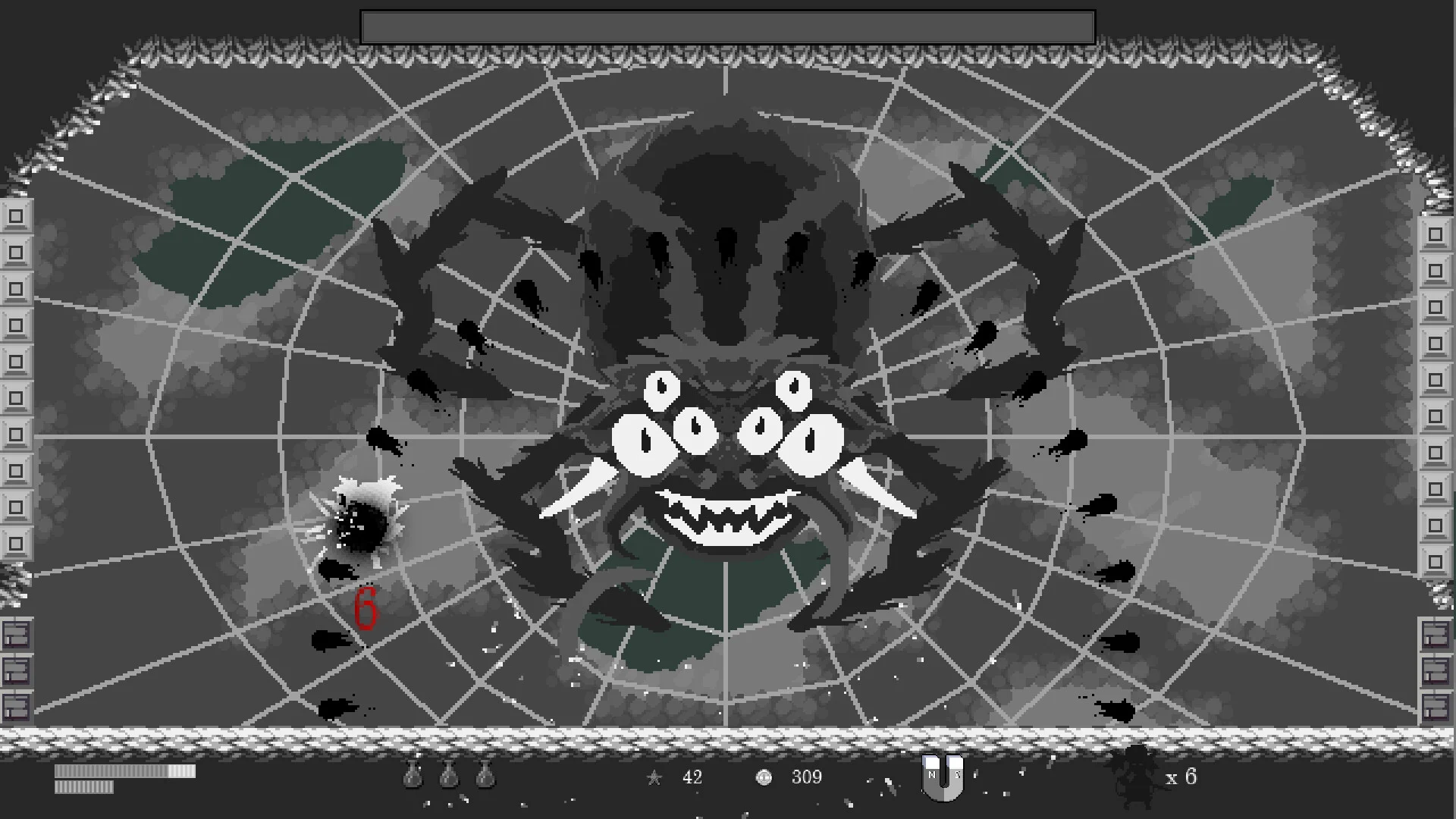 ボスバトルも本作の見所です。木のような質感を持つ巨大なボスキャラクター、不気味な蜘蛛のような敵、そして禍々しいデザインの各種ボスが登場し、それぞれが圧倒的な威圧感を放ちます。モノクロームで統一されたダンジョンの背景では、敵の存在感がより一層引き立てられ、緊張感あふれるバトルが展開されます。
