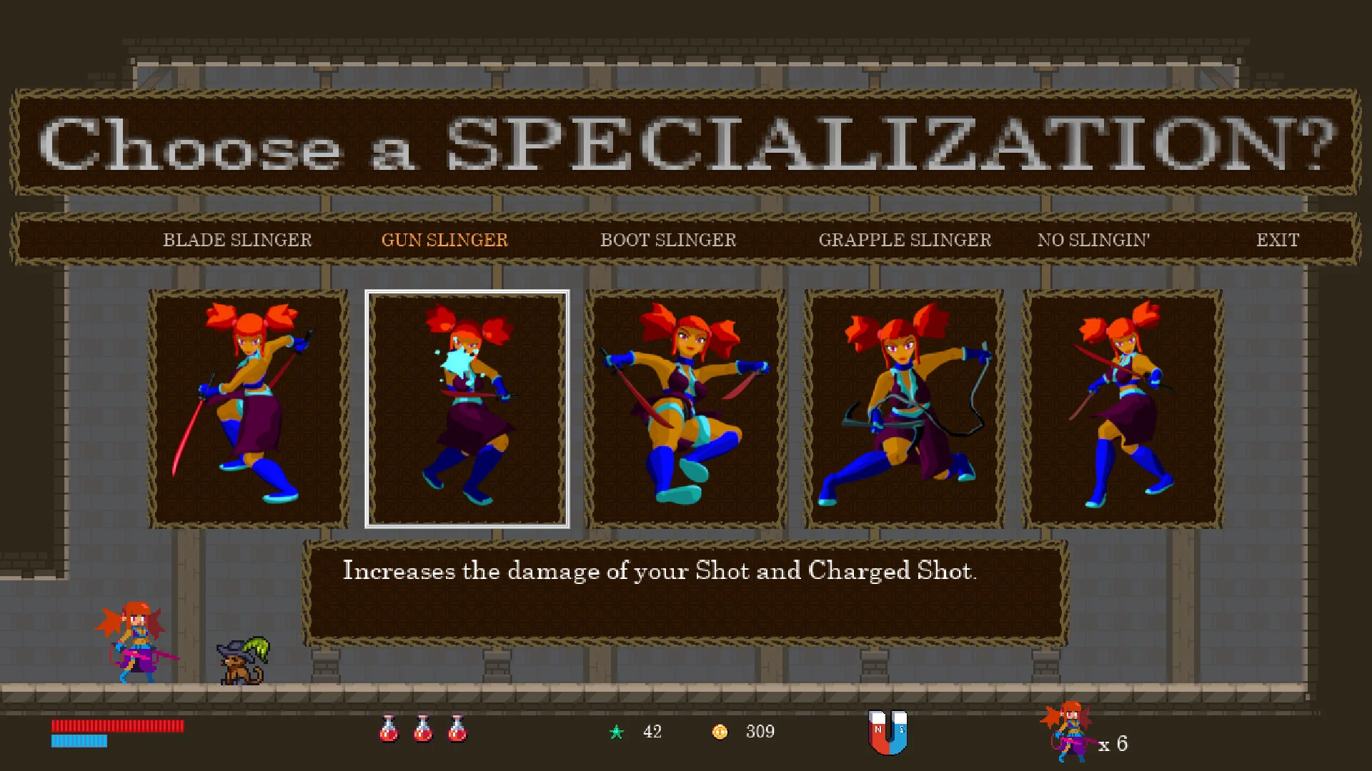 ゲームプレイの中心を担うのは、さまざまなアクション要素です。スウィング、ダッシュ、スライド、そしてスライスといった基本アクションにくわえて、敵を爆破・斬撃・斬り裂くか、敵の頭に跳ね返って攻撃するなど、戦闘の自由度が高く設計されています。プレイヤーキャラクターの動きは素早く滑らかで、ピクセルアートながらもスピード感とスタイリッシュさが感じられます。