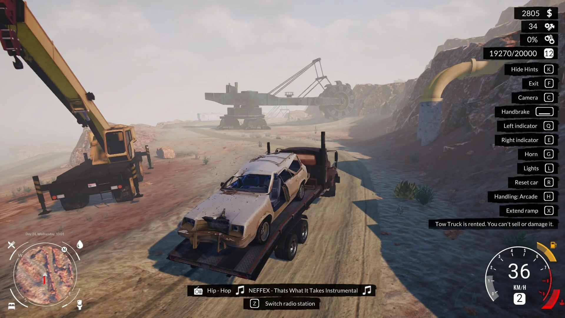ゲームの主要な目標は、古びた倉庫をベースにビジネスを成長させていくことです。車を見つけ、修理し、カスタマイズして販売するという一連の流れを通じて、資金を増やしていきます。単なる商取引に留まらず、ゲーム内では廃墟となった街を走ったり、ビールを飲んだり、金属探知機を持って砂漠をさまよったりと、様々なアクティビティが用意されています。
